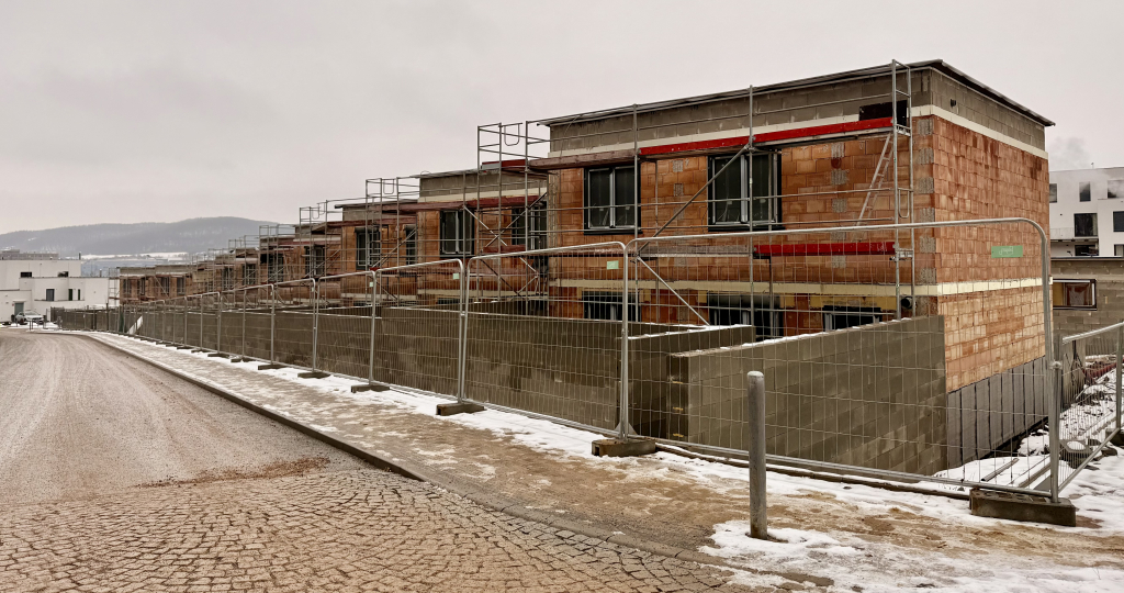 pohled z druhé strany na řadu u II. etapy, kde jsou v 1.NP byty 1+kk se zahrádkou a nahoře s terasou, kterou z tohoto pohledu vidíte
